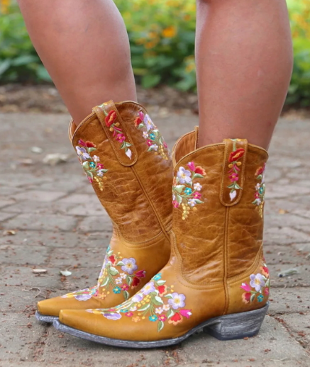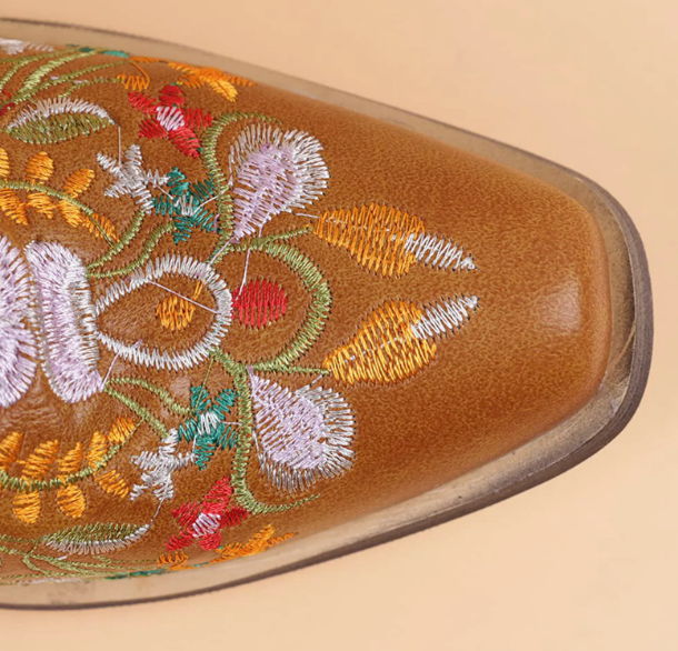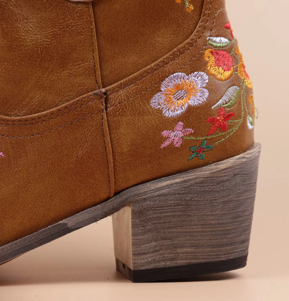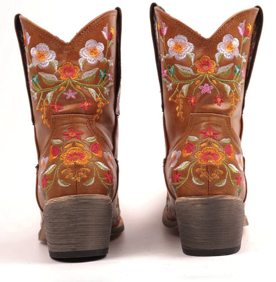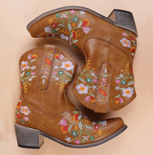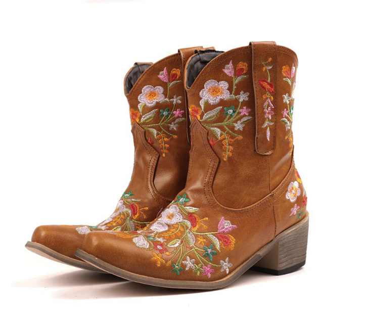 Santiags brodées fleuries pour femmes, en cuir, bottes à talons bas